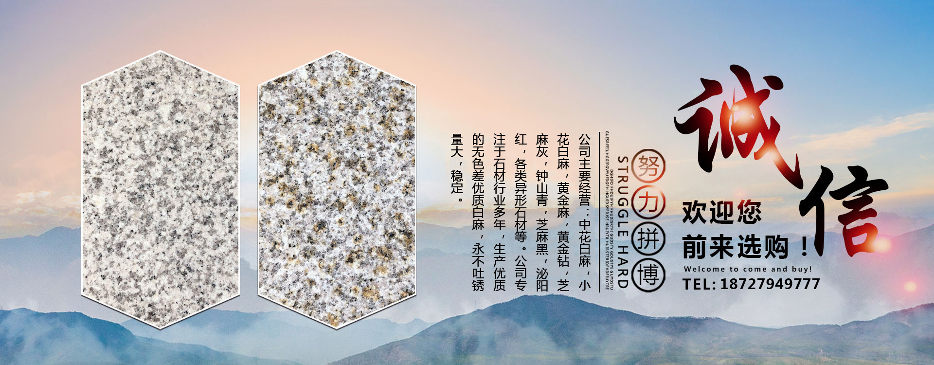 我廠主要經營中花白麻,小花白麻,黃金麻,黃金鉆,芝麻灰,鐘山青,芝麻黑,泌陽紅,各類異形石材等;類目繁多。
